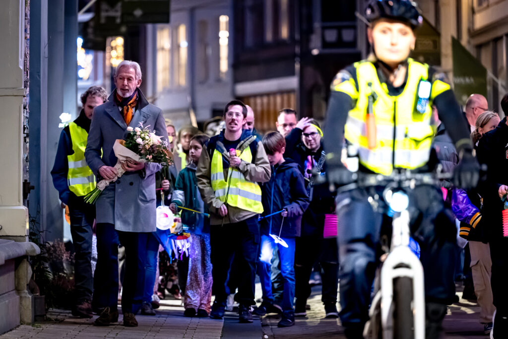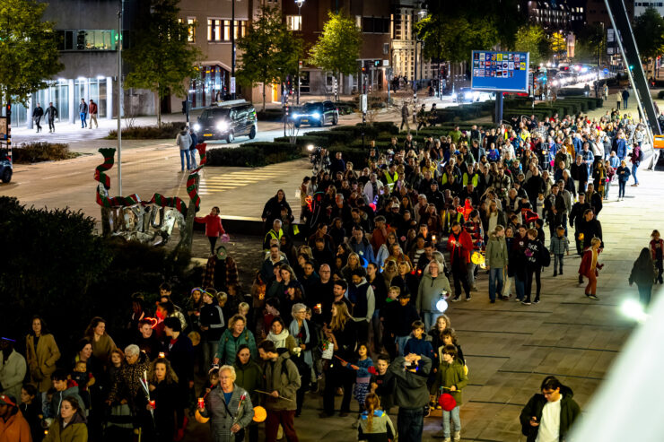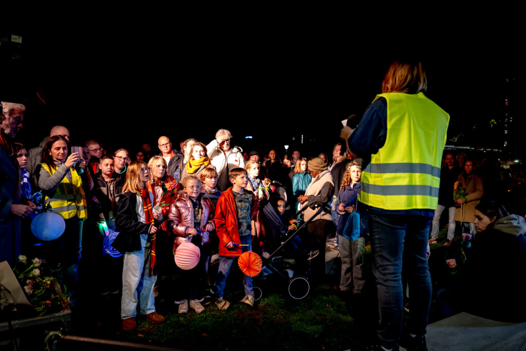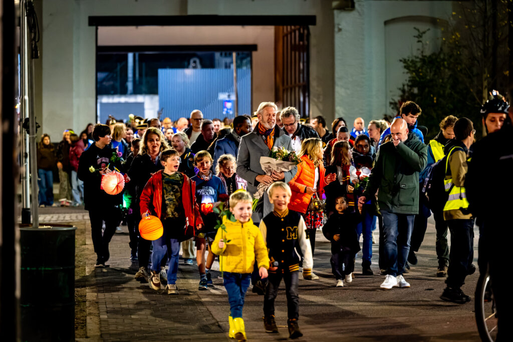 Veel mensen lopen met een lampion en een bloem mee. Onder hen ook leden van Carnavalsvereniging De Blauwwituilen uit Goirle, waar Anne-roos jeugdraadslid was.
