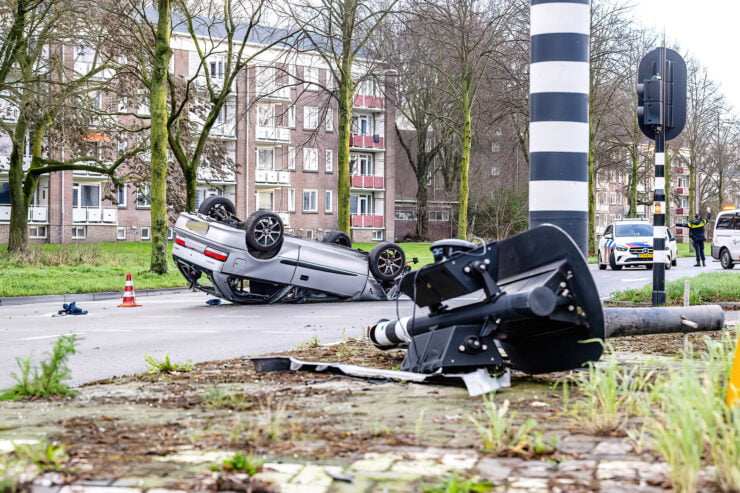 Op de kruising tussen de Ringbaan-Zuid en de Winkler Prinsstraat vond op de dinsdagochtend een eenzijdig ongeval plaats. Hoe dit precies kon gebeuren is niet bekend, maar de bestuurder van een grijze auto belandde in de middenberm. Hierdoor reed hij tegen een lichtmast aan en knalde hij een verkeerslicht uit de grond. De auto eindigde op zijn kop in het midden van de andere rijbaan.