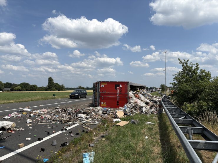 Het ongeval gebeurde iets over half drie ’s middags. Door een klapband raakte de vrachtwagen een vangrail. Hierdoor kwam het voertuig op zijn kant terecht. Er is geen ander verkeer betrokken bij het incident. De chauffeur kwam met schrik vrij.
