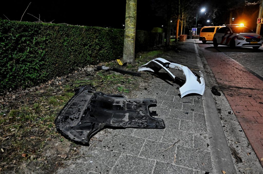 De ravage op de weg was groot. De politie kwam met twee voertuigen ter plaatse en sloot het Kerkeind tijdelijk af om de situatie veilig te stellen.