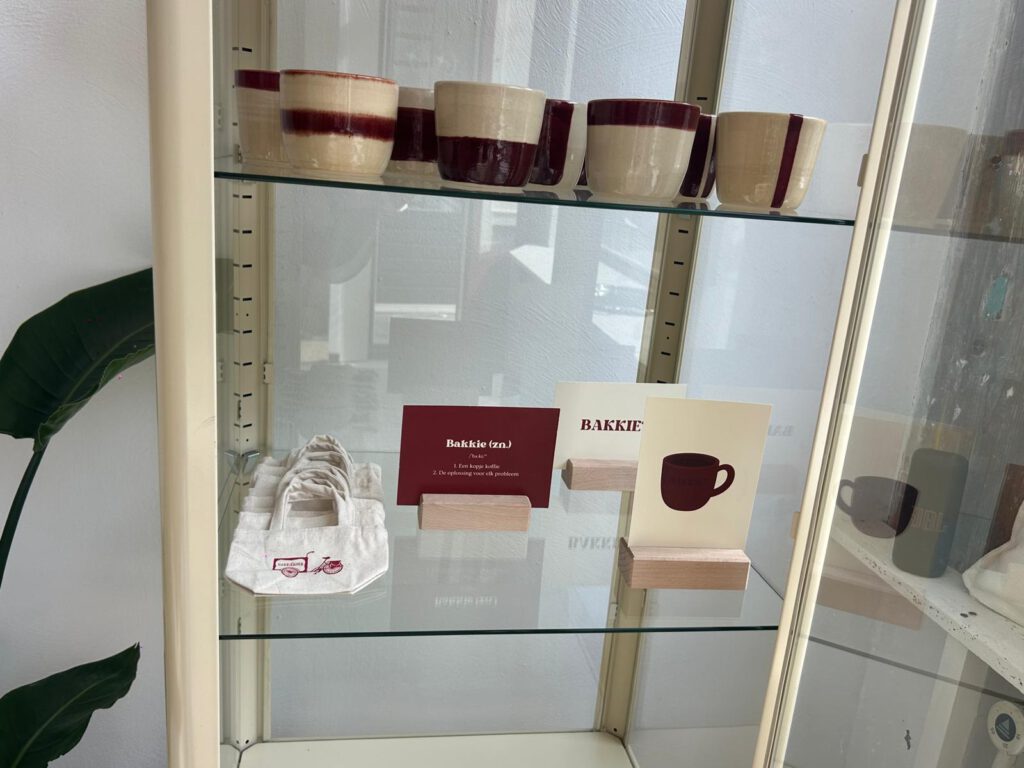 De koffiekopjes die ze verkoopt en andere items die passen bij haar winkel. (Foto: Vanessa Spaanderman)